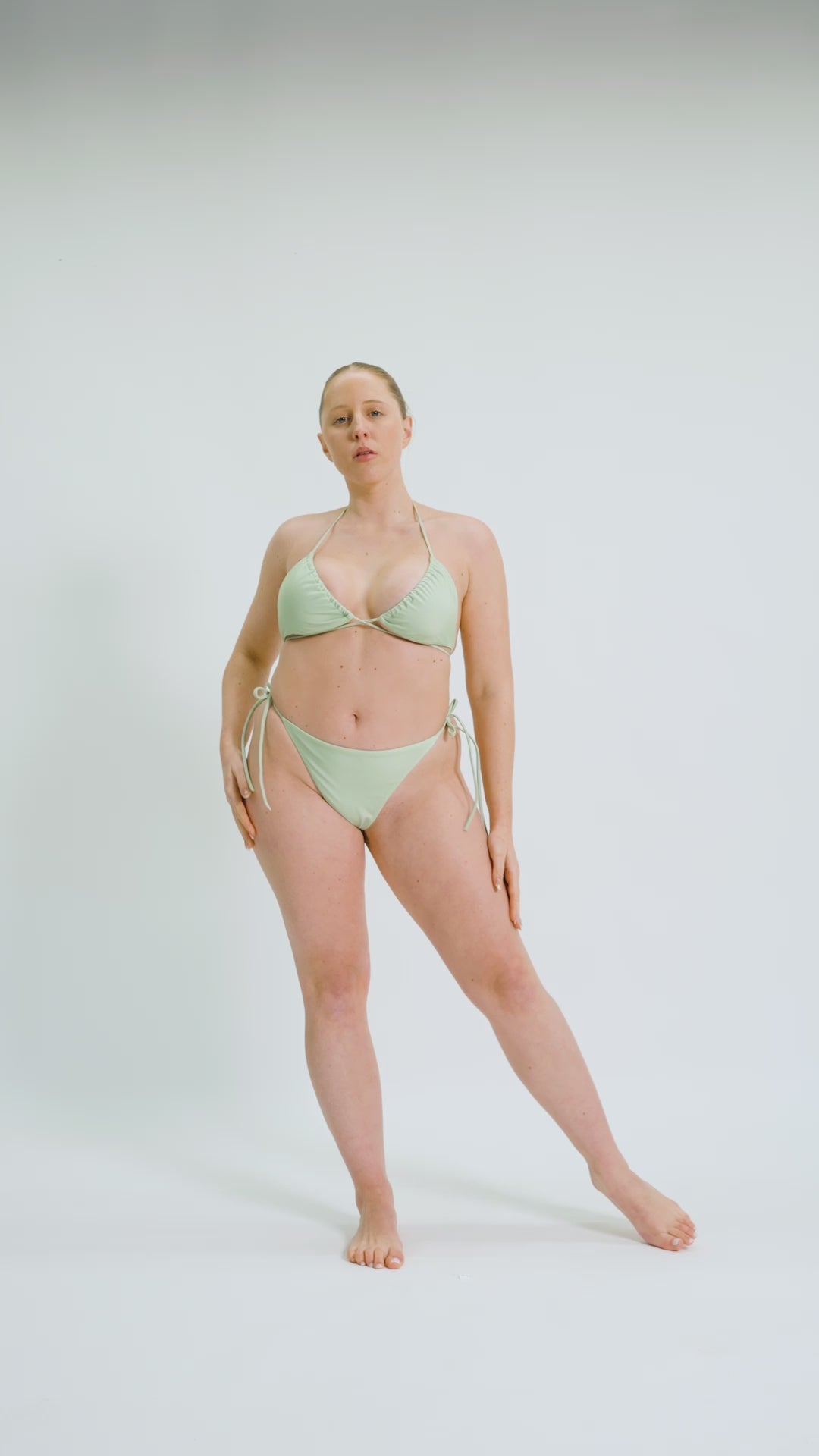 Orchid Haven is a pistachio lycra bikini. It features a simple cut with a crisscross ribbon detail on the waist. The top includes removable padding and ties at the back with a bow. The high-waisted thong enhances the female silhouette and can be tied on both sides with a knot or bow. The Orchid Haven bikini is the first design in the Orchid Collection.
